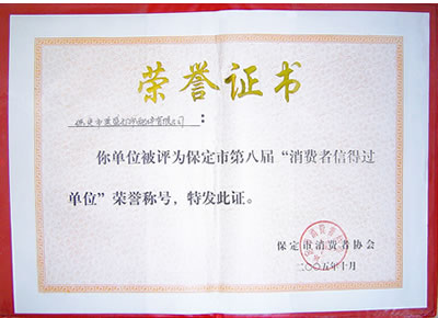 保定市第八屆消費(fèi)者協(xié)會(huì)年終會(huì)議,(中美合資)保定萊盛打印機(jī)配件有限公司以?xún)?yōu)質(zhì)的產(chǎn)品,良好的信譽(yù),完善的服務(wù)從眾多的商家中脫穎而出,被評(píng)為保定市“第八屆消費(fèi)者信得過(guò)單位”,并由保定市消費(fèi)者協(xié)會(huì)頒發(fā)了榮譽(yù)證書(shū)及銅牌。